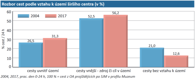 Rozbor cest vozidel projíždějících po SJM kolem Muzea podle vztahu k území širšího centra ukazuje, že v období mezi roky 2004 a 2017 výrazně poklesl podíl cest, které se tohoto území vůbec netýkají. Z cest, které se tohoto území týkají, mají necelé 2/3 cest na tomto území zdroj nebo cíl a téměř 1/3 cest má uvnitř této části města oba konce cesty; pouze 12,6 % cest širším centrem projíždí.“