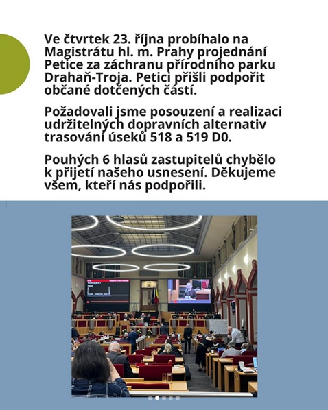 - Ve čtvrtek 23. října 2025 od 17.11 hodin se na zasedání Zastupitelstva hl. m. Prahy veřejně projednávala „Petice za záchranu přírodního parku Drahaň-Troja“.