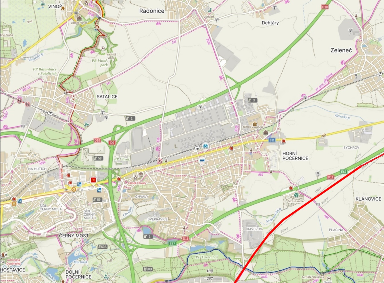 Mapa ukazuje, kde všude okolo Horních Počernic vyrostou další pruhy dálnic, odpočívky pro kamiony, vysokorychlostní železnice aj.