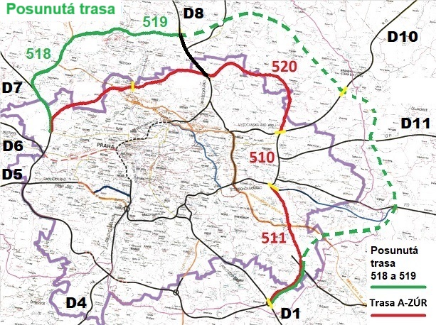 Úsek D0 518–519 v trase A-ZÚR navazuje u Březiněvsi na dálnici D8, na v tunelové variantě připravovaný úsek 520, dále na provozovaný úsek 510 a na úsek 511 v realizaci. Přivedení tranzitní (z velké části nákladní) dopravy do této severozápadní části Prahy sloužící pro bydlení a rekreaci je však možné se vyhnout (viz úvodní obrázek).