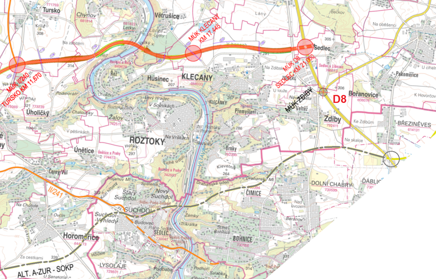 Na mapě je oranžovou čarou znázorněno také propojení Prahy 8 a Prahy 6 – tunel dlouhý 480 m a přemostění údolí Vltavy mostem dlouhým 530 m (komunikace 2+2 pruhy, dvoukolejná tramvajová trať, cyklistická stezka a chodník pro pěší).