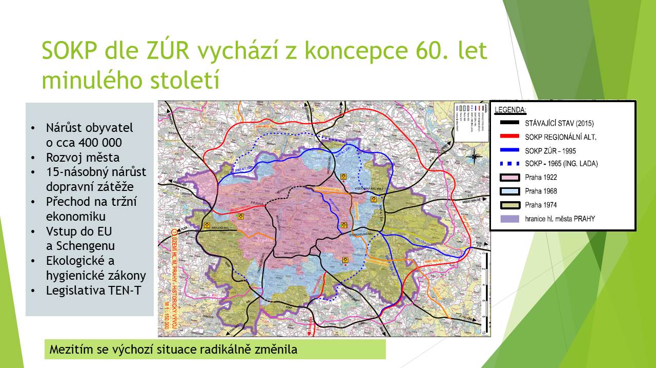 Pražský okruh dle zásad územního rozvoje prosazovaný současnou politickou garniturou vychází z koncepce 60. let minulého století. Od té doby došlo k významnému rozvoji města a obrovskému nárůstu dopravy v důsledku přechodu na tržní hospodářství a zapojení do evropských struktur. Realizace dnes již dálničního průtahu by měla velmi negativní dopady na cca 100 000 obyvatel